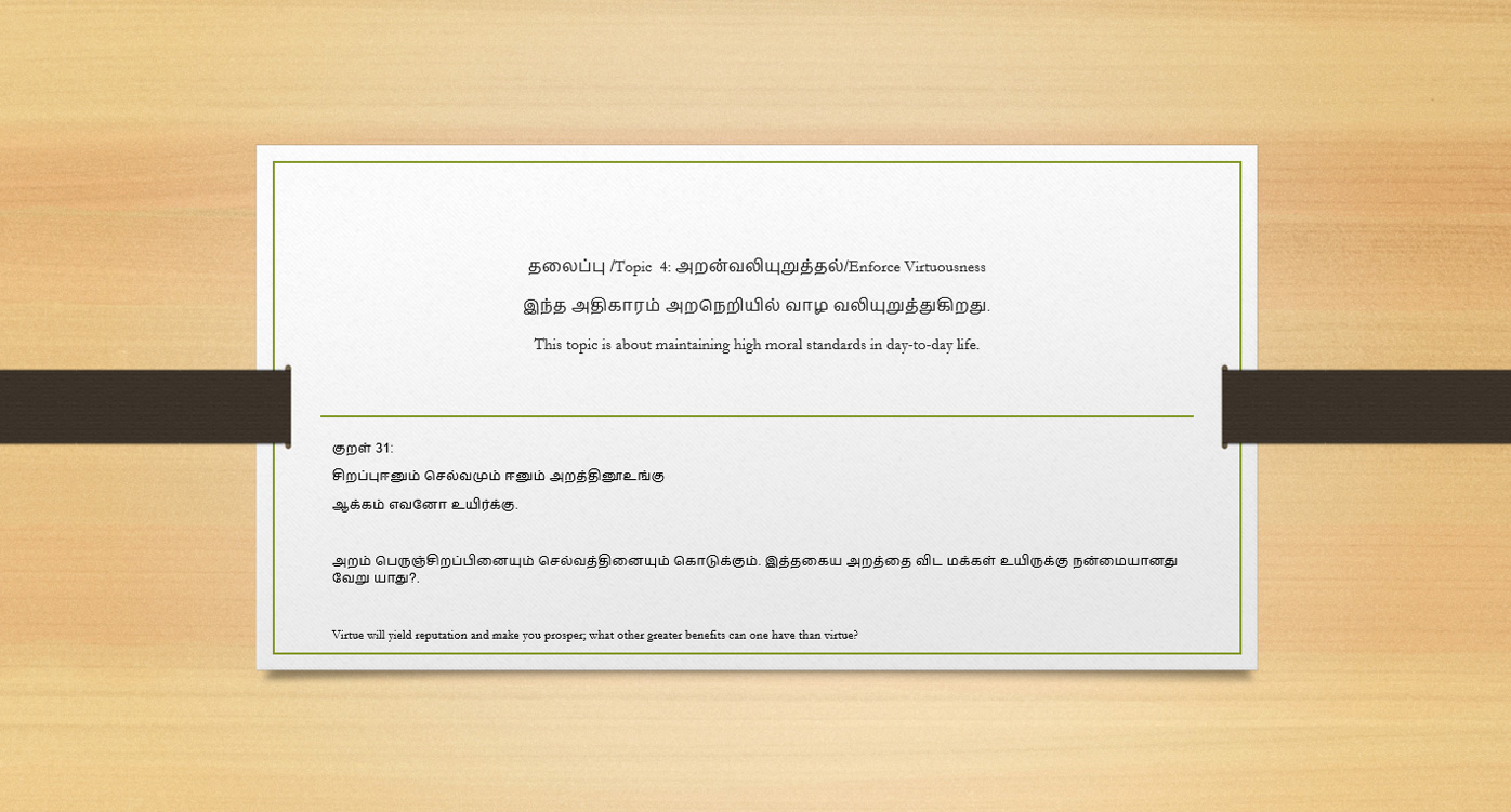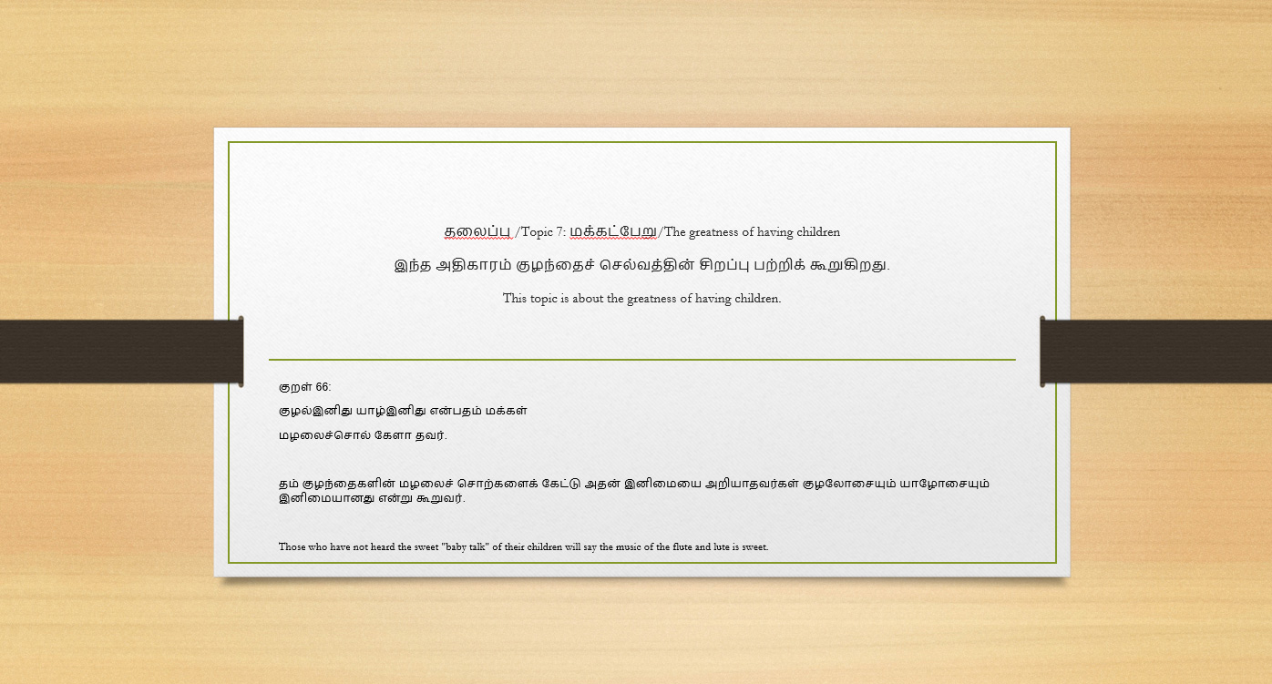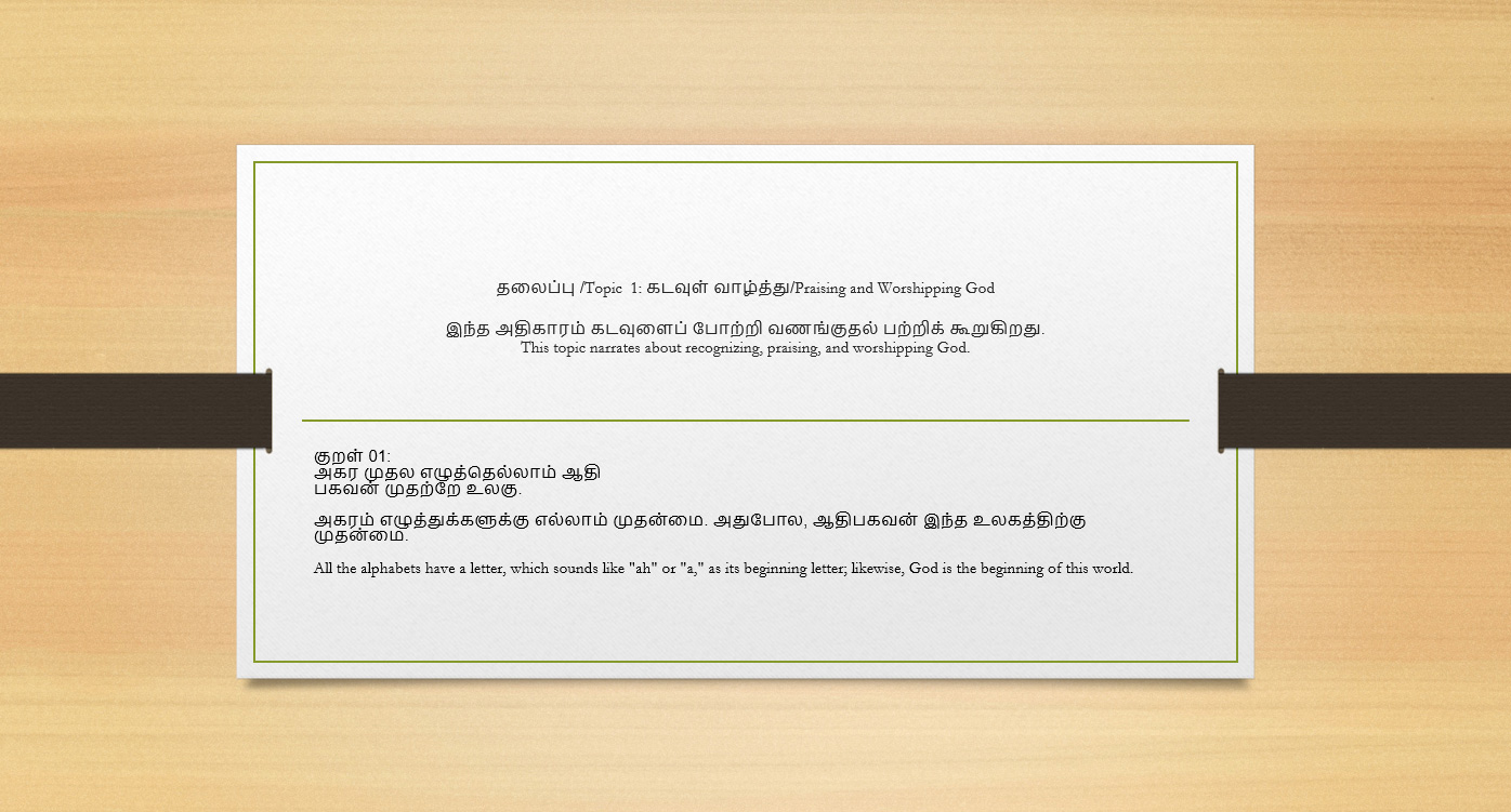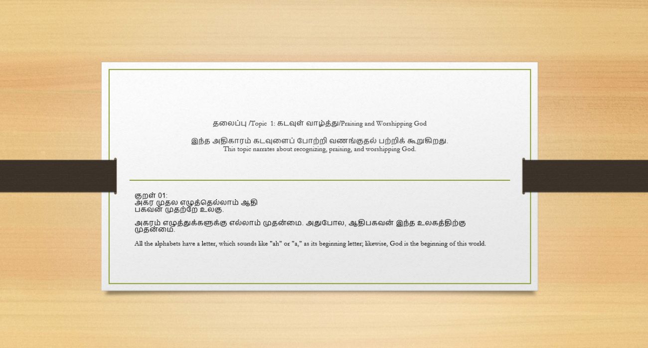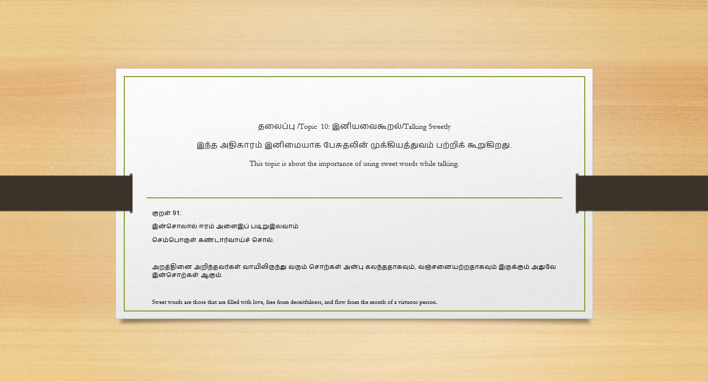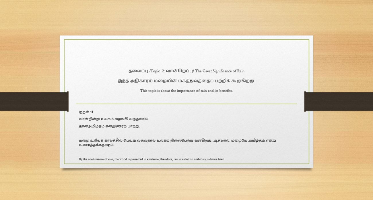 The book’s sample contents are displayed below as animated slides from various topics in Thirukkural. Take a look at them.